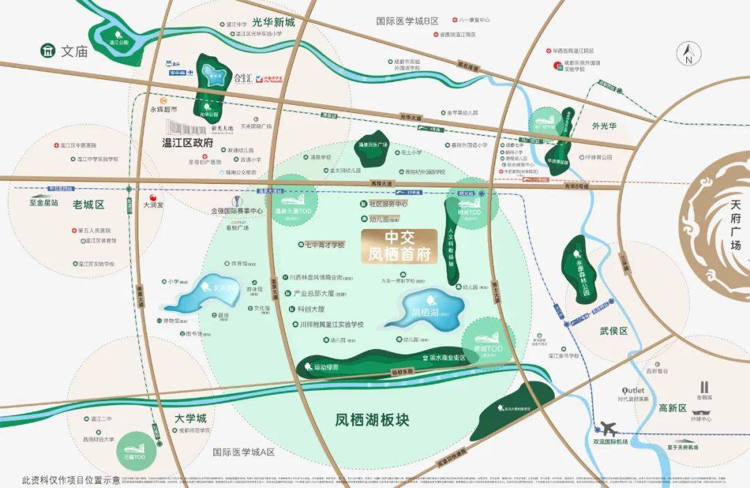 项目择址凤栖湖片区,定位温江政府未来重点打造的产城融合科创CBD,属温江城市核心辐射区,可享光华新城、温江老城、大学城三大传统板块成熟的生活配套,同时凤栖湖板块总规划面积约5.45平方公里,在片区的中心处规划一座约200亩的凤栖湖公园,另外向四个方向延伸出约5万㎡的凤栖绿廊公园,凤栖湖板块的生态底色是承载温江低密改善3.0时代最好的人居底盘;