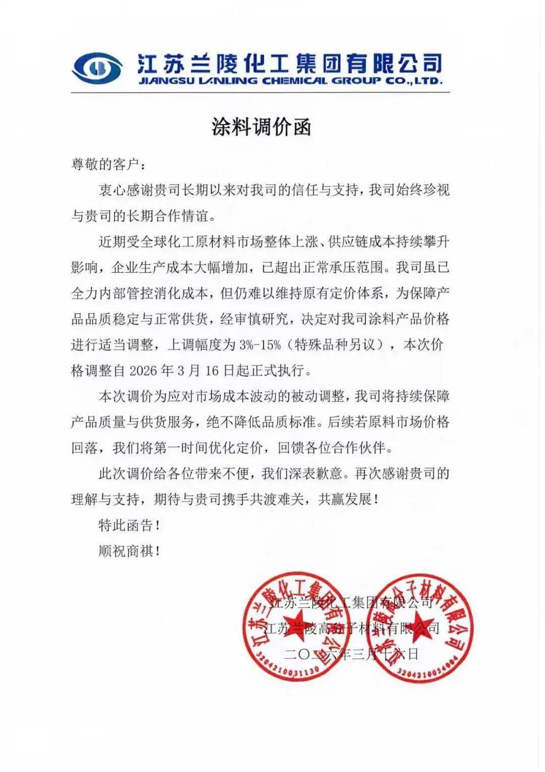3月16日,江苏兰陵化工集团有限公司、江苏兰陵高分子材料有限公司发布涂料调价函并称,近期受全球化工原材料市场整体上涨、供应链成本持续攀升影响,企业生产成本大幅增加,已超出正常承压范围。我司虽已全力内部管控消化成本,但仍难以维持原有定价体系,为保障产品品质稳定与正常供货,经审慎研究,决定对我司涂料产品价格进行适当调整,上调幅度为3%-15%(特殊品种另议),本次价格调整自2026年3月16日起正式执行。